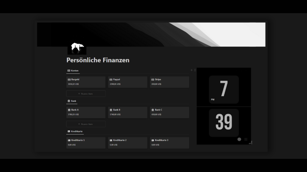 Meistern Sie Ihre persönlichen Finanzen und übernehmen Sie die Kontrolle über Ihre finanzielle Zukunft mit unserer vollständigen Vorlage für persönliche Finanzen in Notion. Diese sorgfältig gestaltete Vorlage gibt Ihnen die Werkzeuge an die Hand, die Sie benötigen, um Ihre Einnahmen, Ausgaben, Ersparnisse und Investitionen effektiv zu visualisieren, zu organisieren und zu verwalten.